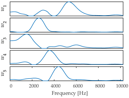 After STFT is computed with the same parameters in the simulation experiment, the TFD matrix is decomposed by NMF with low rank r = 5; the basis and weight vectors are shown in Figure 11. Because the high frequency bands usually have small noise interference, for the five decomposed frequency regions in Figure 11, the spectral bases w3, w4, w5 are located at the frequency band of 1900–4000 Hz and selected to extract the impulse response. The three selected frequency regions and the sub-matrix of corresponding weight are adopted to calculate the inner product of the squared envelope, and the sparse envelope spectra are displayed in Figure 12.