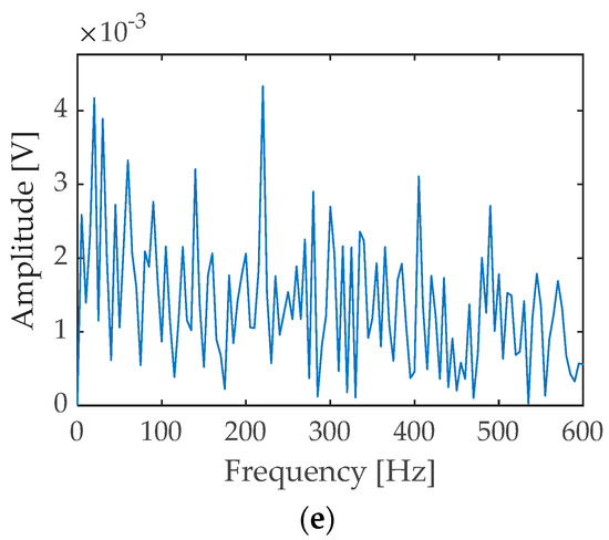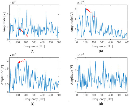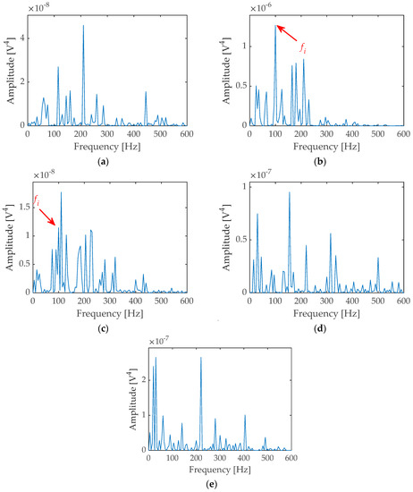 Envelope spectrum with band-pass filtering: (a) Filtered with ; (b) Filtered with ; (c) Filter with ; (d) Filtered with ; (e) Filtered with .