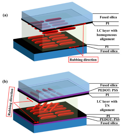 Schematic illustration of device structures for (a) a homogeneously aligned liquid crystal (LC) cell to carry out the optical constant measurement of both types of LC and (b) a twisted nematic (TN)-LC phase shifter with pristine poly(3,4-ethylenedioxythiophene):polystyrenesulfonate) (PEDOT: PSS) as transparent electrodes.