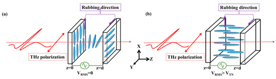 Schematic illustration of the operational principles of a TN-LC THz phase shifter for (a) VRMS = 0 and (b) VRMS > VTN.