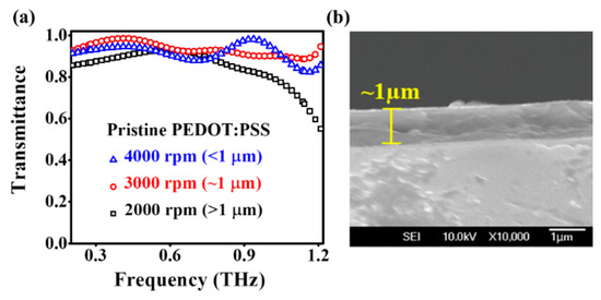 (a) THz transmittance of pristine PEDOT: PSS layers with three different thicknesses controlled by the rotation speed of the spin coater and (b) FESEM cross-sectional image of the 1 µm thick pristine PEDOT: PSS layer deposited on clean substrate by spin coating with a rotation speed of 3000 rpm for 30 s.
