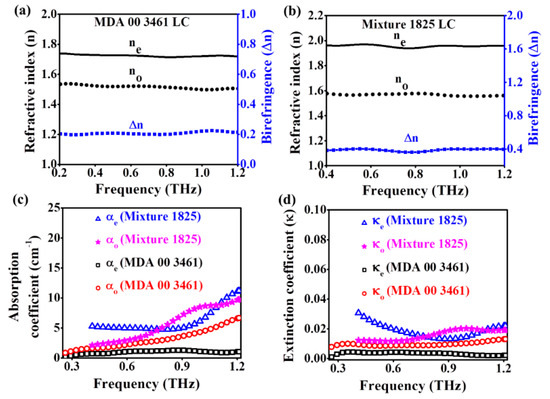 THz optical constants ne, no, and Δn for (a) MDA-00-3461 and (b) Mixture 1825 LC. The (c) absorption (α) and (d) extinction (κ) coefficients represent both types of LC molecules.