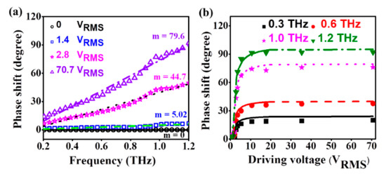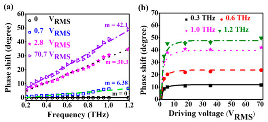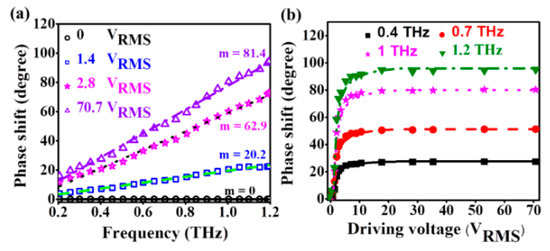 We also constructed a Mixture-250 TN-LC phase shifter with a 250 µm thickness of mixture 1825 LC layer. The phase shift achieved by the device at four different voltages are shown in Figure 7a. The slope of linear fitting curves varies from 2.02/THz to 81.4/THz as the applied voltage is ramped from 1.4 to 70.7 VRMS. The maximum slope achieved is approximately 81.4 at the applied voltage 70 VRMS, which is much higher in comparison with those for the MDA-250 and MDA-550 TN-LC phase shifters. This is expected because of the high birefringence of Mixture 250. We also plotted the phase shift as a function of applied voltage at four different THz frequencies as shown in Figure 7b. There occurred a phase shift greater than 90° at the frequency of 1.2 THz with a VD of approximately 7 VRMS. The experimentally determined VTN of this phase shifter is 0.5 VRMS. The experimental data also agree well with theoretical data that have been predicted. In addition, this work is the first to demonstrate TN-LC-based THz phase shifters using such LCs with higher birefringence. Previously, Du et al. [11] demonstrated a phase shifter with DMSO-doped PEDOT, which exhibited higher conductivities than pristine PEDOT films. However, we found that the electrical conductivity of pristine PEDOT: PSS is suitable enough to operate 90° THz phase shifters.