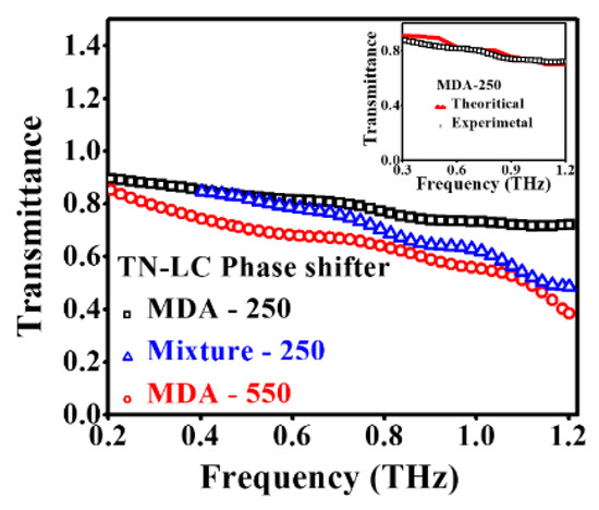 THz transmittance values of MDA-250, MDA-550, and Mixture-250 TN-LC phase shifters are shown in Figure 8. The average THz transmittance of the MDA-250 device is as high as 80% at 0.2 THz and shows a decreasing trend with frequency, down to ~30% at 1.2 THz. The observed behavior can be explained by the frequency-dependence of absorption and the interface reflection of the components of the device, namely, LC, fused silica substrates, PEDOT: PSS, and polyimide alignment layers. The inset in Figure 8 shows the theoretical transmittance curve for the MDA-250 device, which is in good agreement with the experimental data. The transmittance of MDA-550 and Mixture-250 devices show similar trends. The theoretically calculated transmittance values for MDA-550 and Mixture-250 TN-LC THz phase shifters are 64.5% and 62.8%, respectively, at 1 THz. This is very close to our experimental data of Mixture-250 devices at 1 THz (i.e., 62%). The theoretical and experimental transmittance of the MDA-250 device is superior, being ~73% at 1 THz. Overall, the loss experienced by our devices compares favorably with THz phase shifters previously reported [8,9,10,11]. Moreover, we can attribute the gradually decreased transmittance in the THz frequency range to the strong frequency-dependent transmittance of fused silica substrates. This has been described in our previous work [8]. By considering the structure described in Figure 1 and combining the complex permittivities (and refractive indices) of pristine PEDOT: PSS, fused silica, and liquid crystals, we can estimate the loss caused by different interfaces. The loss is mainly contributed by fused silica substrates and the LC itself [8].