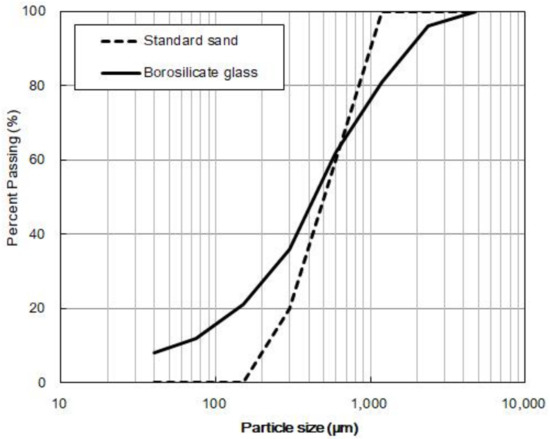 To investigate the effect of borosilicate glass on the thermal neutron shielding performance and the compressive strength gain of cement mortar, the borosilicate glass (boron content of 13% by mass, DURAN-Borosilicate glass 3.3, SCHOTT) crushed by the jaw crusher was used in this study. Table 1 shows the chemical composition of borosilicate glass. Figure 1 and Figure 2 show the crushed glass and the particle size distribution of crushed glass, respectively.