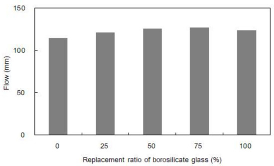 Figure 4 shows the flow of fresh cement mortars. The flow value of plain cement mortar was 108 mm. The flow values of all the cement mortars with borosilicate glass were slightly higher than that of plain cement mortar. However, the replacement of borosilicate glass showed no significant influence on the fluidity of the cement mortar.