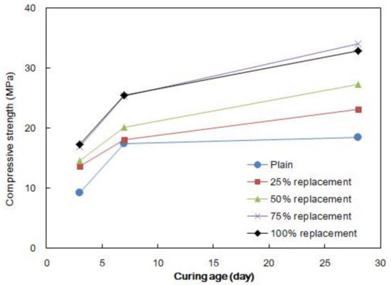 Figure 5 shows the compressive strength of cement mortar at the age of 3, 7 and 28 days. All the cement mortars with borosilicate glass showed higher compressive strength compared to the plain cement mortar, regardless of the age of cement mortar. The compressive strength of cement mortar with borosilicate glass increased as the replacement ratio of borosilicate glass increased. However, when the level of replacement ratio exceeded 75%, the compressive strength of cement mortar did not significantly increase.