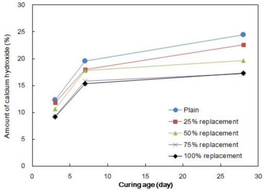 Figure 6 shows the amount of calcium hydroxide in the cement mortar at the age of 3, 7 and 28 days. The amount of calcium hydroxide in the cement mortar with borosilicate glass decreased as the replacement ratio of borosilicate glass increased up to 75%. However, when the level of replacement ration exceeded 75% (reached 100%), the amount of calcium hydroxide in the cement mortar did not decrease.