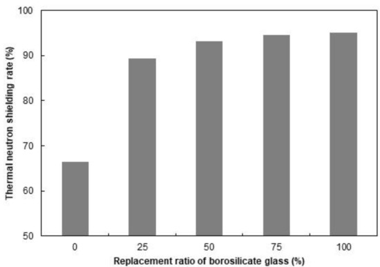 It is known that the thermal neutron shielding rate of concrete increases as the boron content in concrete increases [4,5]. From the results of testing for the neutron shielding performance, the cement mortar with borosilicate glass showed higher thermal neutron shielding rates as the replacement ratio of borosilicate glass in the cement mortar increased. The increase of thermal neutron shielding rate of cement mortar with borosilicate glass is associated with the increase of boron content in the cement mortar.