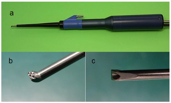 - Nakagawa, H.; Kim, S.D.; Mizuno, J.; Ohara, Y.; Ito, K. Technical advantages of an ultrasonic bone curette in spinal surgery. J. Neurosurg. Spine 2005, 2, 431–435. [Google Scholar] [CrossRef] [PubMed]