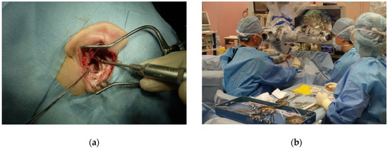 Microscopic ear surgery (MES) (a) A mastoidectomy in progress. (b) Surgeons performing MES.