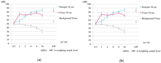 (a) Air-conducted noise levels measured at 10 cm from the tip of the tool; (b) Air-conducted noise levels measured at 70 cm from the tip of the tool.