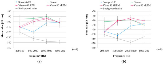 Figure 10 shows the mean values of the measured skull vibrations and the background noise level at four frequency bands. In the frequency bands of 500–2000 Hz and 2000–8000 Hz, the mean values of the Sonopet® Omni with an LT-vibration tip did not exceed the values for the Visao® revolution speed of 40k rpm or 80k rpm as well as the Osteon® drill. The peak values of skull vibrations by the Sonopet® Omni with an LT-vibration tip were lower than the vibrations of Visao® at 40 k rpm in the band of 500–2000 Hz; those of Visao® at 80k rpm in the bands of 500–2000 Hz and 2000–8000 Hz; and those of Osteon® in the bands of 500–2000 Hz and 2000–8000 Hz. No significant differences in the skull vibrations were observed among the three instruments below 500 Hz or above 8000 Hz.