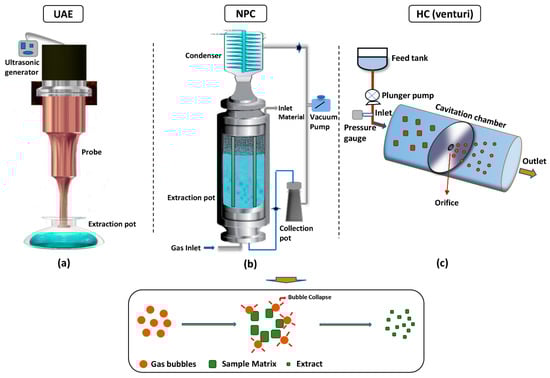 Types of cavitation reactor (a) UAE (ultrasound-assisted extraction); (b) NPC (negative pressure cavitation); (c) HC (hydrodynamic cavitation, venturi) and overall mechanism.