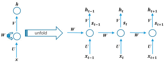 RNNs are widely used in the field of natural language processing. Unlike traditional feedforward neural networks, RNN introduces directional loops that can handle correlated inputs. As so, it can be used to process sequence data. The basic structure of an RNN is shown in Figure 3. In Figure 3, x, h, and s represent the input, output, and hidden states, respectively. U, V, and W represent the weight matrix between the input and hidden layers, hidden layers and outputs, and the hidden layers, respectively.