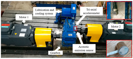 Raw AE signals and vibration signals collected from gear pitting fault experiments were used to validate the effectiveness of the presented method for the diagnosis of gear pitting faults. The experiments were carried out on a gearbox test rig. The raw vibrational signals and AE signals of seven different gear pitting conditions were collected during the experiments. The gearbox test rig is shown in Figure 4. It consists of two 45 kW Siemens servos, one of the servos is the driving motor, and the other is the loading motor. An acceleration sensor and an AE sensor were mounted on the surface of the gearbox housing. The main parameters of the gearbox are shown in Table 1.
