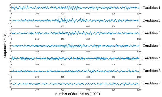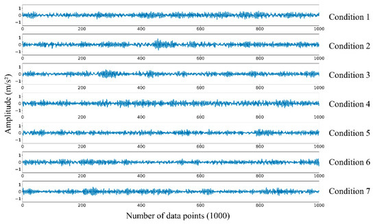 The sample raw vibrational signals of the gears are shown in Figure 6. As shown in Figure 6, Conditions 1 and 3 have relatively distinct spikes and show slightly different from the remaining five vibrational signals. The raw vibration signals of the remaining five conditions are not significantly different.