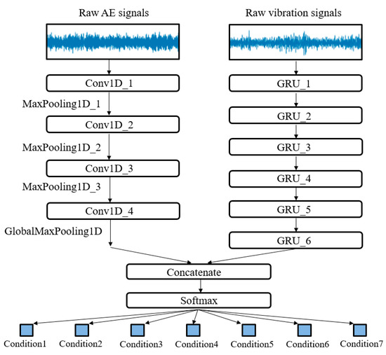 The number of samples for the vibration data/ AE data under each condition was 1000, with 800 for training set, 150 for validation, and 50 for testing. Each condition had the same number of samples. The CNN was connected using 4 convolutional layers, which was an arbitrary choice based on the experience. The number of channels in each layer was set 32, 64, 128, and 128, respectively. The kernel size of all convolutional layers was set as 7 and stride as 1. Padding took ‘Same padding’ in order to maintain the same data size. The pool size was set as 2 for all the pooling layers. For pooling, the strides were set as none and padding as ‘valid’. The AE signals used in the CNN contained 3072 features per sample. The GRU network used 6 stacked GRUs for training. The cell size of each GRU layer was set as 256, 256, 128, 128, 64, and 64, respectively. The vibrational signals used in the GRU network contained 616 features per sample. The batch size was set as 256. Both kernel initializer and recurrent initializer used the he-normal [25] method. The loss function was set as categorical cross-entropy. A stochastic gradient descent algorithm was used as the optimizer. Except for the last layer, the ReLU function was used as the activation function for the layers. In the last layer, a softmax function was used to classify gear pitting faults. An NVIDIA GeForce GTX 1080 Ti graphics card was used in the PC for training purpose. The general procedure of the data processing using the presented method is shown in Figure 8.