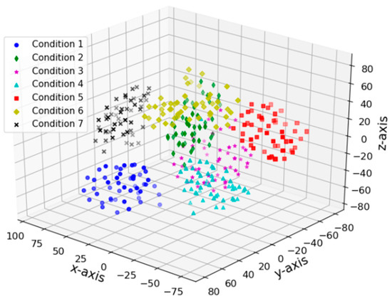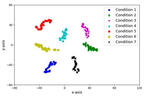 To show the effectiveness of the concatenated features obtained by CNN to extract features from AE signals and GRU network to extract features from vibration signals, samples for t-SNE visualization were processed. The 3D result of the t-SNE visualization is shown in Figure 10. The 2D result of the t-SNE visualization is shown in Figure 11. It can be seen from the two figures that the concatenated features of the seven gear pitting conditions were accurately clustered. The clear clusters formed by the concatenated features obtained by the proposed method shown in 3D and 2D pictures indicate the effectiveness of the proposed method for extracting features from the AE and vibration signals for gear pitting fault diagnosis.