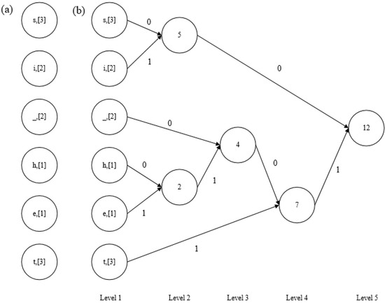 In the next step, nodes are generated according to the frequencies of the symbols. As shown in Figure 3a, each node created at this stage stores a symbol and the frequency of that symbol, e.g., (i, [2]) demonstrates that the ‘i’ symbol has a frequency of two in the text.