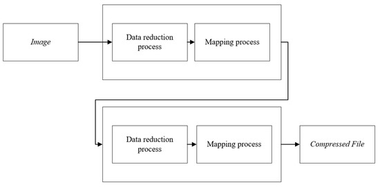Compressor and decompressor operations generate an image compression system. The compressor process consists of two stages: preprocessing and encoding. Unlike the compressor process, the decompressor operation consists of the postprocessing phase after the decoding process. The flowchart of the compression process is shown in Figure 5. As shown in the compression process, the pre-processing step, which differs based on the application, is applied before the coding step. In the reverse process, the postprocessing step can be applied to eliminate some of the residues from the compression process after the compressed code has been decoded.
