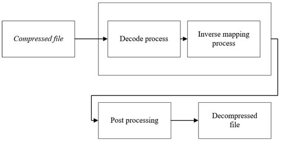 The decompression process can be subdivided into the stages shown in Figure 7. The decoding process consists of two steps. In the first stage of this process, it matches the codes in the compressed file with the original values and reverses the encoding. The values obtained after this step are processed, and the original mapping process is reversed. At the end of these processes, the image can be improved with a post-processing step.