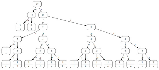 The Huffman tree of the text is formed, as shown in Figure 8. To produce a bit codeword of each character, the Huffman tree is traversed from the root to the leaf node where the target character is located. For example, in order to reach the character ‘c’, the sequence of 10010 bits must be followed, respectively. In addition, each character symbolized by the Huffman encoding algorithm is presented in Table 6.