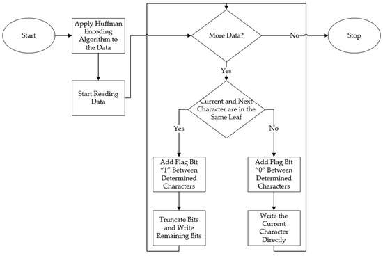 The main objective of the proposed algorithm, and all compression algorithms, is to reduce the number of bits needed to symbolize the characters. The flowchart of the proposed method is shown in Figure 9.
