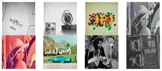 The performance of the proposed encoding algorithm was tested on three different sets of pictures. In the first group, eight randomly selected images, frequently used in the literature from USC-SIPI [38] miscellaneous databases, were chosen to prove the efficacy of the proposed coding algorithm. The sample images selected from the database included color and grayscale images in order to prove the performance of the encoding algorithm, and are shown Figure 11.