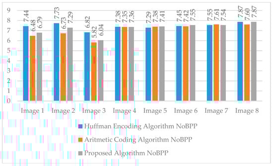 The second term used in the evaluation phase of the proposed encoding algorithm was NoBPP. The main purpose of compression algorithms is to reduce the bits per pixel. Therefore, the NoBPP value is used for more consistent and accurate results. The NoBPP value is presented for each group of images. NoBPP values obtained from the algorithms applied to the first group of images are shown in Figure 17. The NoBPP values of the images in the second group are presented in Figure 18.