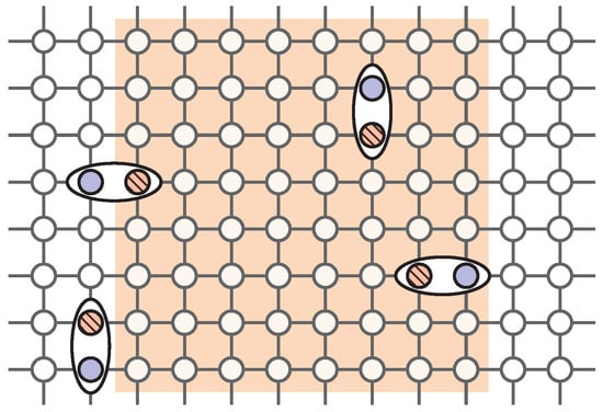 It is much easier instead to generalize to higher dimension the trivial Mott insulating phase, characterized in the one dimensional case by a non-vanishing value of the charge parity operator. As already mentioned, its physics amounts to a background of singly occupied sites, in which holons and doublons occur in entangled pairs with a finite coherence length. These in principle can occur in arbitrary dimension. A two-dimensional example is depicted in the cartoon of Figure 2. In presence of such physics, the parity operator must be properly generalized in order to remain non-vanishing in the insulating phase, and zero elsewhere. Let us start with the case of a M legs ladder: rather than considering a string of site parities delimited by two boundary sites, as in the definition in Equations (4) and (5), one now takes branes of sites delimited by boundary strings, as proposed in []. Explicitly, we can introduce: