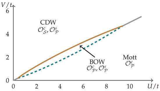 - Hirsch, J.E. Charge-density-wave to spin-density-wave transition in the extended Hubbard model. Phys. Rev. Lett. 1984, 53, 2327. [Google Scholar] [CrossRef]