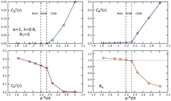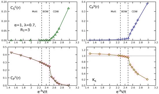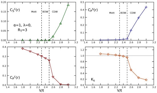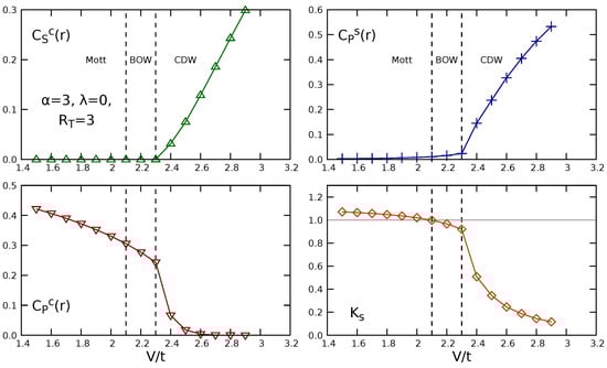 The charge string correlator (first panel) was computed at the maximum distance, i.e., in the middle of the chain . Instead, because of a possible staggered behavior, the parity correlators were averaged over the sites and . In all cases, the results for the NL correlators support the presence of the three already mentioned phases, namely Mott, BOW and CDW, which can be inferred from the results in Figure 4, Figure 5 and Figure 6, by taking into account the classification outlined in Table 1. The computation of is helpful for identifying the transitions. In particular, the Mott–BOW transition, which involves the opening of the spin gap, is signaled by . We observed that, in all the figures, the BOW phase appears slightly shifted from the point towards higher values of V; thus, the long-range interaction basically does not alter the phase diagram of the EHM. We noticed that, in the case of screened Coulomb repulsion, the amplitude of the interaction must be scaled by the factor in order to compare the result with the EHM. We chose in such a way that the contribution from the fourth nearest neighbors, which we neglect, is of the same order as the contribution neglected for dipolar interaction. Such a choice should make the screened Coulomb interaction comparable to the case , for which it is known that the long-range interaction does not qualitatively modify the phase diagram []. We verified that the results are barely affected by the truncation of the long range interaction. To this end, we considered the screened Coulomb interaction truncated to . In that case, we assumed, with the same criterion, . Data are shown in Figure 7. We performed the computation for a system of size , with up to 1400 DMRG states and eight sweeps. We observed that the results are comparable with those obtained for the case . In fact, the BOW phase appears closer to the point ; however, this small difference could also be caused either by finite size effects or by the difficulty of DMRG in reaching convergence despite the eight sweeps. On the other hand, in the case of dipolar interaction, one may infer, by comparison with the work in [], where up to five neighbors are included, that the transition lines are not much affected by adding further neighbors to the interaction or by increasing the system size from to the thermodynamic limit. These findings complement those reported in the previous literature [,]. On the contrary, we expect that, in the case of unscreened long-range Coulomb interaction (), an increase of could modify our results, since the neglected terms in the present analysis are much higher than in the other cases, and the analytic results on the persistence of the phases are controversial [,].