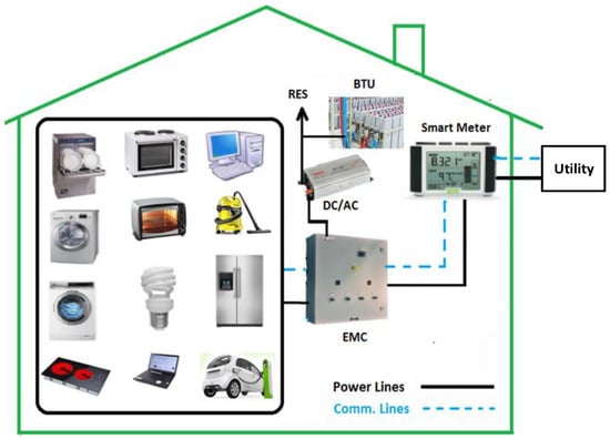 For the system’s stability, further reduction of electricity consumption and maximum user comfort, RES and BSUs were also integrated. Additionally, for photovoltaic cells’ electricity generation, temperature, solar irradiance, battery charging/discharging rates and its storage system, different assumptions were considered from [].