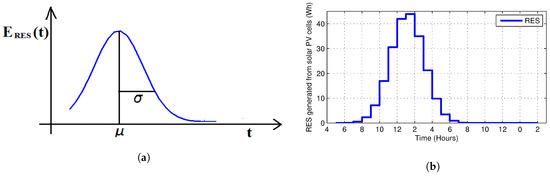 (a) Gaussian function representing the approximate PV cells’ energy generation (Wh) []. (b) RES-generated energy for a single home.