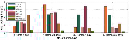 Waiting time is a very important feature of appliance scheduling for optimal energy consumption in the smart grid. To reduce electricity cost, usually, waiting time increases. A user wants to start an appliance, but due to scheduling time constraints, the user has to wait for to start its operation. Our main objective in this work was to minimize the user electricity bill, keeping in view the maximum comfort level of the end-user. Figure 6 shows that we achieved our objective using heuristic techniques for optimal scheduling. The graphs show that TG-MFO outperformed ACO, CSA, GA, FA and MFO in achieving a nearly-zero waiting time for the end-user.