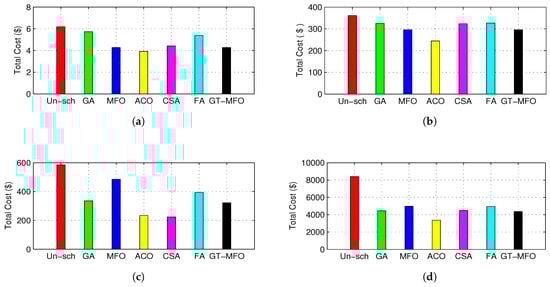 Figure 7 shows the electricity cost for the unscheduled and scheduled (with ACO, CSA, GA, FA, MFO and TG-MFO) load. The results show that the electricity cost of the meta-heuristic algorithms-based scheduled load was very low as compared to the unscheduled load cost. In Figure 7a, the operation of a single home for a single day is considered. In this case, ACO-based scheduling showed better results as compared to all scheduled and unscheduled costs. Similarly, in Figure 7b, the case of a single home for 30 days (one month) is shown, in Figure 7c, that of 30 homes with different LOTs and power ratings for 30 days (one month), and in Figure 7d, the case of 30 homes for 30 days; the scheduled cost was very much as compared to the un-scheduled cost. In all four cases, ACO outperformed all scheduling techniques.