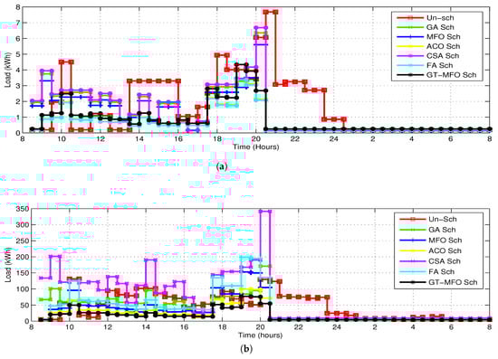 Figure 8 shows the total hourly load of a single home and 30 homes with unscheduled and scheduled loads with the bio-inspired algorithms ACO, CSA, GA, FA, MFO and TG-MFO. The results show that as compared to the unscheduled load, meta-heuristic algorithm-based scheduled load was shifted to the off-peak hours, where not only the price was low, but RES was also available, considering the end-user’s time constraints for the maximum comfort level. The figure shows that our proposed algorithm gave comparative results for both single and multiple homes with different sizes, power ratings and LOTs.