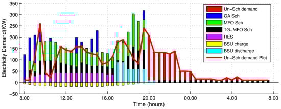 In order to minimize the consumed energy for further reduction of the total cost, RES and BSUs were integrated in homes. Figure 9 shows that the day-time load will be supported by RES, while extra energy will be stored in BSUs for running the load in peak hours. It drastically reduced the cost. The figure depicts that our proposed TG-MFO algorithm has intelligently not only shifted the load to day-time off-peak hours for cost minimization, but also reduced the PAR.