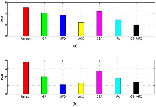 PAR for un-scheduled and GA-, MFO-, ACO-, CSA-, FA- and TG-MFO-scheduled load. (a) PAR for a single home. (b) PAR for 30 homes.