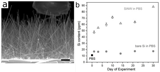 (a) SEM image of SiNW densely grown onto a Si wafer piece. Scale bar 1 m. (b) Si release from a sample covered densely with SiNW (triangles) to the surrounding PBS in the course of immersion at a temperature of at 37 C as measured with ICP-AES, compared to a bare silicon wafer piece serving as control (dots). For comparison, the Si content of PBS alone is plotted at Day 0 (square).