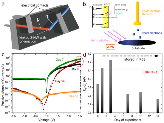 The most relevant properties of SiNWs in terms of sensing applications are electrical properties. These were monitored in parallel to the AFM measurements using the same SiNWs by recording I-V characteristics at 14 time points between 1 and 70 days of immersion. In the simplest scenario, the conductance of a homogeneously doped SiNW should decrease, if the diameter and consequently the cross-section shrinks due to dissolution. Besides the conductance, the transconductance, commonly utilized as output value for SiNW sensors in FET configuration, should also be affected. However, changes in the leakage current, e.g., due to salt deposition and surface contamination, would also affect the measurements but the measurement of their contribution is non-trivial. To overcome this, we used SiNWs with an encoded p–n junction. As we grew SiNWs in a bottom-up manner, the implementation of p–n junctions was facile and the synthesis did not differ in principle from the one of SiNWs used as FET sensors. To enable localization of the p–n junctions within the SiNWs, we introduced the aforementioned crystal kink at the p–n junction interface (marked with an arrow in Figure 2c) [12]. For a schematic of the measurement set-up, please refer to Figure 3a.