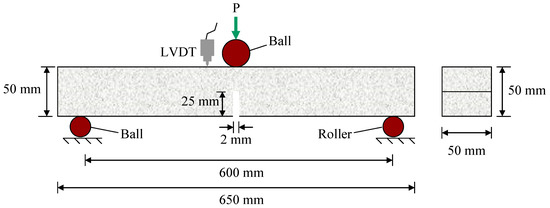 Cylinder specimens (ψ100 × 200 mm) were cast from each mixture for compression testing; three cylinders each for testing at 4 ages (7, 14, 28, 56 days). Prism specimens with diminution of 50 × 50 × 650 mm and 80 × 150 × 700 mm were cast for the determination of fracture energy (GF) and the critical stress intensity factor (KSIC), respectively. Four specimens were fabricated for each mixture that tested the two specimens at 2 ages (14 and 56 days). The specimens and concrete mixtures were prepared in accordance with ASTM C192. After casting, test specimens were covered with plastic sheets and left in the casting room for 24 h. They were then demolded and put into a 100% RH moist-curing room at about 23 °C until time for testing. One day before testing, the fracture energy specimen and the critical stress intensity factor specimen, as shown in Figure 1 and Figure 2, were prepared by cutting a notches 25 mm deep by 2 mm width and 50 mm deep by 2 mm width, respectively, at the middle of the beam specimens.