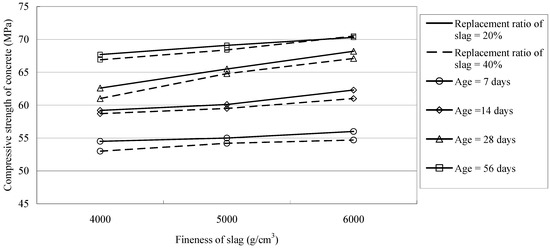 On the other hand, it can be found from Table 3 that under the same replacement ratio (20% and 40%) of slag, the mixtures S6R2 and S6R4 presented the highest strengths at an early age (7 days), followed by S5R2 and S5R4, and the S4R2 and S4R4 mixtures are the lowest. This is due to the fact that incorporating finer slag into concrete may fill the micro-voids much better, exhibit higher reactivity and producing higher packing density, resulting in a larger strength enhancement. In addition, a beneficial effect of the fineness of slag on concrete strength can be seen in Figure 4; the compressive strength of the slag concrete increases as the fineness level of the slag incorporated into the mixture increases for each age and various slag replacement ratios. It is also found in Table 3 that there are significant strength gains from 7–28 days and again from 28–56 days for the mixture containing finer slag. For example, the strength increment of the mixtures S6R2 and S6R4 that contain finer slag displayed an increase rate from 100% at 7 days to 121.8% and 122.7% at 28 days, and 125.5% and 128.9% at 56 days, respectively. These are obviously larger than the corresponding mixtures of S4R2 and S4R4 that increased from 100% at 7 days to 114.9% and 115.1% at 28 days, and 124.2% and 126.2% at 56 days, respectively. At 28 days, the strength of the finer-slag concrete is shown consistently to exceed that of the reference concrete, except in the mixtures of S4R2 and S4R4. This is particularly significant considering that the cement replacement of finer slag in each case is up to 40%. In addition, the highest strength achieved at 56 days was 70.5 MPa for the mixture S6R4 with 40% slag replacement, while the strength obtained for the corresponding reference mixture was a relatively lower value of 65.5 MPa.