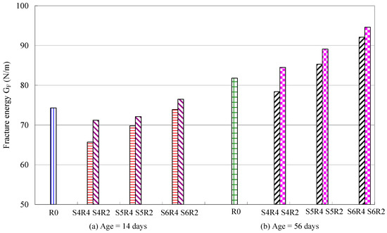 In this research, fracture energy (GF) was determined using a notched beam in a three-point bending test. Load-deflection curves were plotted from the tests. The energy absorbed in the test to failure is represented by the area below the load-deflection curve for the specimen. The area represents the fracture energy per unit area of the fracture surface. The GF was calculated using Equation (1). Concrete specimens were tested at 14 and 56 days. Results are presented in Table 4. At earlier ages (14 days), the GF values of each slag mixture are mostly less than that of the reference mixture, except slag mixture S6R2. In addition, the concrete containing more slag (40%) presented smaller GF than that with less slag content (20%) for various ages. Nevertheless, the presence of the finer slag has a beneficial effect on the GF of concrete. As shown in Figure 5, increasing the fineness level of slag leads to an increase of the GF value of concrete. Even at an earlier age of 14 days, the GF value of the mixture with finer slag (S6R4) is in turn higher than that of the mixtures S5R4 and S4R4 for a similar slag replacement ratio of 40%. This implies that although the pozzolanic reaction of slag does not yet fully occur at early ages, the superior filling effect and more active hydration reaction of the finer slag can increase the density of concrete, resulting in an increased fracture resistance. After 56 days, the GF value of the slag mixtures almost exceeds that of the reference mixture. In addition, it is also found in Table 4 that the increment of fracture energy for each slag concrete from 14 days to 56 days is attained by 18–24%, which is much higher than that of reference concrete (10.1%). This signifies that, during the period, the pozzolanic reaction of slag activates, associating with the filling effect to enhance the fracture toughness of the slag concrete.