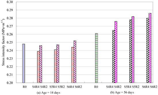 The stress intensity factor for concretes with various fineness levels and replacement ratios of slag at the ages of 14 days and 56 days.