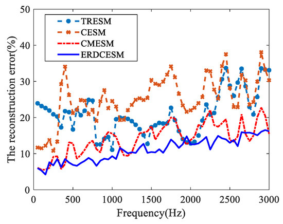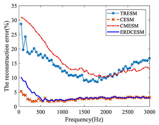 To compare the reconstruction performances of the four methods (TRESM, CESM, CMESM, and ERDCESM) for different types of sources, simulated measurements were carried out. For CESM, CMESM, and ERDCESM, the CVX toolbox was used for the l 1   norm optimization. For TRESM, the optimal regularization parameter was determined via the L-curve method [11]. In the measurements, a single source was selected to simulate the sparse source, and a simple supported plate was used as a type of spatially extended source. Simulations of ERDCESM- v were also implemented to verify the superiority of combining with FB.