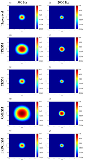 Figure 4. The calculated sound maps of (a) Theoretical map at 500 Hz, (b) TRESM map at 500 Hz, (c) CESM map at 500 Hz, (d) CMESM map at 500 Hz, (e) ERDCESM map at 500 Hz, (f) Theoretical map at 2000 Hz, (g) TRESM map at 2000 Hz, (h) CESM map at 2000 Hz, (i) CMESM map at 2000 Hz and (j) ERDCESM map at 2000 Hz for a single source.