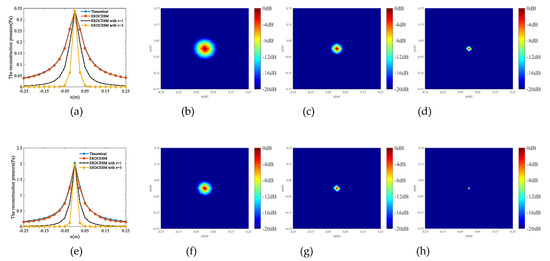 Figure 5. Pressure distributions of (a) the sound pressure at 500 Hz, (b) ERDCESM with ν = 0 at 500 Hz, (c) ERDCESM with ν = 1 at 500 Hz, (d) ERDCESM with ν = 3 at 500 Hz, (e) the sound pressure at 2000 Hz, (f) ERDCESM with ν = 0 at 2000 Hz, (g) ERDCESM with ν = 1 at 2000 Hz and (h) ERDCESM with ν = 3 at 2000 Hz for a single source.