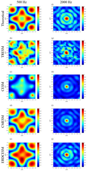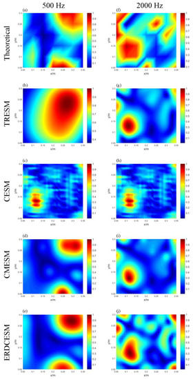 Figure 12. The Experimental results of (a) Theoretical map at 500 Hz, (b) TRESM map at 500 Hz, (c) CESM map at 500 Hz, (d) CMESM map at 500 Hz, (e) ERDCESM map at 500 Hz, (f) Theoretical map at 2000 Hz, (g) TRESM map at 2000 Hz, (h) CESM map at 2000 Hz, (i) CMESM map at 2000 Hz and (j) ERDCESM map at 2000 Hz for a plate sound source.